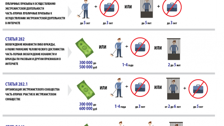 Публичные призывы к осуществлению экстремистской деятельности, совершенные с использованием средств массовой информации, наказываются принудительными работами на срок до пяти лет с лишением права занимать определенные должности или заниматься определенной деятельностью на срок до трех лет или без такового либо лишением свободы на срок до пяти лет с лишением права занимать определенные должности или заниматься определенной деятельностью на срок до трех лет.